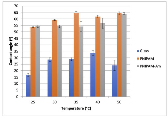 The images of the live CA measurements are shown in Figure 3. The CA values of all the evaluated surfaces are summarized in Figure 4. The glass substrate showed a hydrophilic surface, with CA ranging between 15° and 35° at different temperatures. The surfaces coated with a polymer layer were more hydrophobic compared to the glass surface when evaluated at temperatures ranging from 25 °C to 50 °C, as the CAs of the surfaces coated with a polymer layer ranged between 53° and 63° at different temperatures. Overall, for the surfaces coated with a polymer layer, the CA tended to increase slightly as the temperature increased, which indicated increased hydrophobicity.