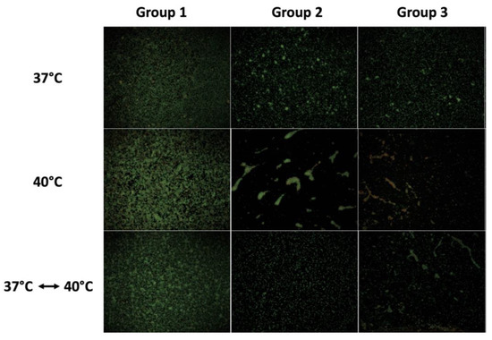 BacLightTM staining images showing differences in bacterial death rates between the evaluated groups at different temperature set points.