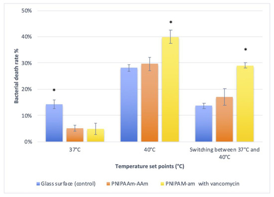 To test the efficacy of the drug delivery system evaluated in the current study, we assessed the growth of S. epidermidis around PNIPAAm-coated surfaces loaded with vancomycin. Staphylococcus is one of the pathogens most frequently associated with implanted medical devices [49,50]. The results of the bacterial tests suggest that the PNIPAAm-coated surfaces were better able to preserve the antibiotic before the temperature increase, as the control group showed more bacterial death compared to the group of polymer-coated surfaces at 37 °C. Both polymer-coated groups (i.e., with and without the antibiotic) showed similar rates of bacterial death at 37 °C. This may indicate that the polymer did not reach the transition phase, which would cause polymer shrinkage and, subsequently, drug release. Differences in bacterial death between the two polymer groups were observed when the temperature was increased to 40 °C. In these conditions, significantly higher rates of bacterial death were observed in the presence of the polymer containing the antibiotic. This increase was attributed to the release of the antibiotic from the polymer coating after polymer shrinkage. These findings suggest that polymer coatings (as drug carriers) may not affect or change drug properties. We also observed higher rates of bacterial death in the presence of the polymer containing vancomycin when the temperature was continuously changed between 37 °C and 40 °C, but bacterial death was less extensive than that seen at the constant temperature of 40 °C.