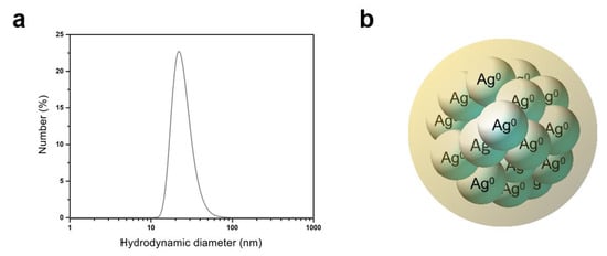 The maximum band of absorbance observed at 420 nm indicates the formation and corresponds to the SPR of the greenly synthesized AgNPs selected to be used in this study. The nanometer size and moderate polydispersity of the AgNPs were verified using DLS analysis. An average hydrodynamic diameter of 25.94 ± 0.30 nm and a PdI of 0.659 ± 0.085 were obtained. Additionally, the AgNPs presented a Zeta potential of −33.4 ± 2.6 mV, indicating a moderate colloidal stability. Figure 1 illustrates the obtained distribution curve of hydrodynamic diameters and a schematic representation of an AgNP.