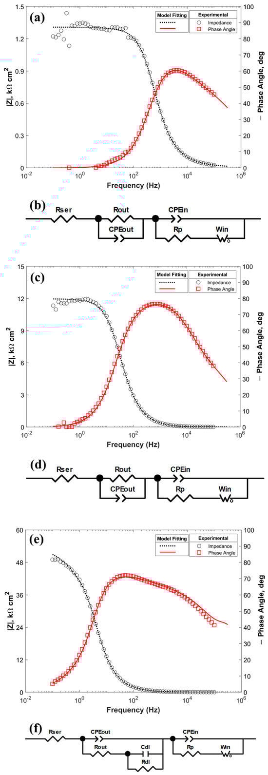 The Bode plots for the samples along with the fitted curve and corresponding electrical models are shown in Figure 8. The data shows that there is noise and error associated with low frequency data. However, good fit was obtained for all samples. The PEO/ZnO and PEO/ZnO+P coating’s EIS response was modeled with the same circuit as shown Figure 8b,d, and a different circuit was used to fit the PEO/P coating. Rser is the uncompensated solution resistance; Rout and CPEout are the impedance and constant phase element of the outer SP layer, respectively; CPEin and Cin are the constant phase element and capacitance and of the PEO layer, respectively; Win is the Warburg element of the lower dense part of the PEO coating; and Rp is the impedance of the upper porous part of the PEO coating. CPE is a capacitive element with a constant phase deviation from an ideal capacitor. The impedance of CPE is given by , where The Warburg element used in the fitting represents finite diffusion with a permeable boundary, and its impedance is given by , where W0 (Ohm−1 s−1/2) is the diffusion-related parameter, and B is given by , where (cm) is the thickness of diffusion layer, and D (cm2 s−1) is the diffusion constant [47].
