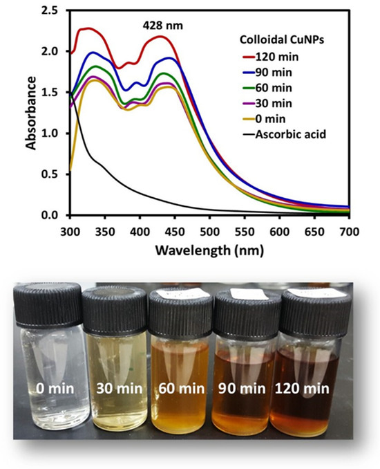 Figure 1 shows the absorption spectra obtained at different times and the color change due to the formation of colloidal CuNPs. In an aqueous solution, CuNPs exhibited a broad and strong absorption signal around ~428 nm, corresponding to the surface plasmon resonance (SPR) of CuNPs. Ascorbic acid treatment is responsible for the broadening of CuNP SPR accompanied by a blue shift, indicating the formation and growth of smaller well-dispersed CuNPs, as reported elsewhere [28].