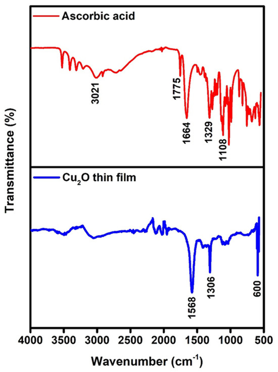 The provision of ascorbic acid in the Cu2O thin film formation on GCE was studied by FTIR. The typical IR spectrum of pure ascorbic acid is presented in Figure 2, where characteristic peaks appeared at 3021, 1775, 1664, 1329, and 1108 cm−1, respectively [29,39]. A group of peaks in the region 3216–3529 were unassigned and were due to the O-H stretches. The peak at 3021 cm−1 was assigned to the =C-H stretching vibrations. The C=O bond stretching was observed at 1775 cm−1, whereas the 1664 cm−1 vibrations belonged to the C=C. The stretching at 1329 cm−1 originated from the C-O-C functional group. The C-O-H bond probably contributed to the peak at 1108 cm−1. In the IR spectrum of Cu2O thin film (Figure 2), the peaks associated with C=O and C-O-H bonds disappeared.