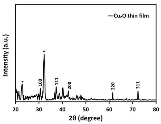 The crystal structure of Cu2O thin film on GCE was studied by XRD. The obtained XRD pattern of Cu2O/GCE is presented in Figure 3, where the peaks at 30.6°, 37.4°, 42.6°, 61.4°, and 72.4° corresponded to the 110, 111, 200, 220, and 311 planes of cuprite, indicating the crystalline nature of Cu2O thin film formed on GCE. The observed peak positions were well-matched with JCPDS# 05-0667, confirming the presence of body-centered cubic (bcc) Cu2O on the surface of GCE as a thin film [29,45,46]. The XRD spectrum indicated that peaks indexed to Cu2O were dominated in the spectrum, ruling out the presence of CuO in the film formed on the surface of GCE. The peaks indicated by -asterisk in the spectrum were due to the ascorbic acid adduct [47] and showed polycrystalline behavior, which is necessary and favorable in integrating Cu2O as a thin film on the surface of GCE.
