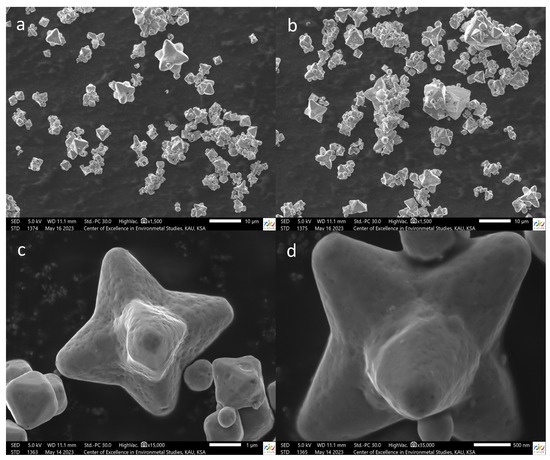SEM images of Cu2O/GCE at different magnifications (a,b) 1500×, (c) 15,000×, and (d) 35,000×.