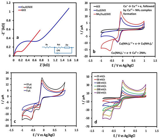 (a) Nyquist plot of GCE and Cu2O/GCE, (b) CV curves of GCE, Cu2O/GCE, and NH3/Cu2O/GCE in 0.1 M pH 7 phosphate buffer, (c) Cu2O/GCE coating of different volumes and (d) effect of scan rate.