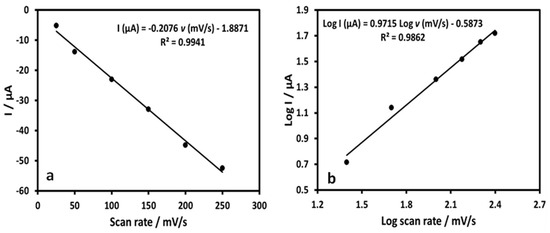 Plot of (a) the peak current versus the scan rate and (b) the logarithm of the peak current versus the logarithm of the scan rate.