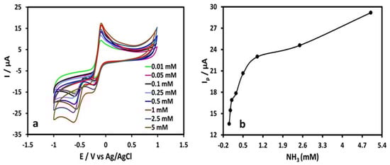 Figure 8a shows the CVs of Cu2O/GCE with different concentrations of NH3 coated on it. The CVs were recorded under the same experimental conditions in 0.1 M pH 7 phosphate buffer and the concentrations of NH3 were 0.01, 0.05, 0.1, 0.25, 0.5, 1, 2.5, and 5 mM, respectively. The current of the second cathodic peak significantly increased with the increasing concentration of NH3. In Figure 8b, the reduction peak current as a function of the concentration of NH3 is plotted. It was observed that the reduction peak current rapidly increased at low concentrations, followed by a gradual increase at high concentrations. This phenomenon is also attributable to the adsorption of NH3 on the surface of Cu2O/GCE [54].