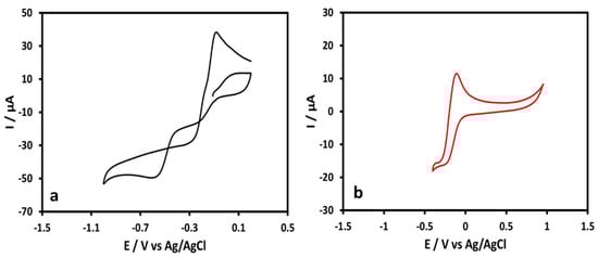 In another potential bias (Figure 9b), from −0.4 V to +1.0 V, there was an oxidation peak that appeared due to the oxidation of Cu2O to CuO, and an associated reduction peak was observed. In Figure S3 (Supplementary Information), the CV initiated at OCV with the first vertex potential was the same as in Figure 6b; however, the negative vertex potential was fixed at −0.4 V. The depressed reduction peak was due to the reduction of CuO into Cu2O and, at a potential more negative than this, the deposition of Cu was possible. This means that, while reversing the scan from −0.4 V, there should be no oxidation peak, as the deposition of Cu was not undertaken. However, the appearance of a sharp and well-shaped oxidation peak established our assumption that the oxidation peak was due to the conversion of interfacial Cu2O into CuO and not due to Cu deposited at the electrode surface limited by adsorption. These observations illustrate the importance of the changing vertex potentials that may notably affect the detection procedure.