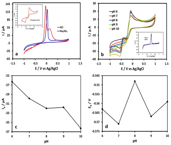 (a) CV curves of NH3/Cu2O/GCE in 0.1 M KCl and 0.1 M Na2SO4, (b) in different pH, (c) peak current versus pH plot, and (d) peak potential versus pH plot.