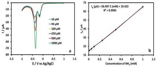 The SWV analysis of NH3/Cu2O/GCE showed a strong signal under optimum conditions. Figure 11a shows the SWVs of Cu2O/GCE with different NH3 concentrations in the range of 10 µM to 1000 µM. Well-defined peaks proportional to the concentration of NH3 were observed. The linear regression equation (Figure 11b) was Ip (µA) = 50.497 C (µM) + 19.423 (R2 = 0.9995) with a detection limit (3.3 × standard deviation of blank/slope) of 6.23 µM determined at a single to noise ratio of 3, which was commensurate with the so far reported with a MWCNT/Cu nanocomposite paste electrode [17], considering the present work based on the NH3 surface modification, and enabled the quick on-site testing of NH3 in environmental samples. The sensor fabrication steps, as well as the detection medium, are important parameters to consider while developing an electrochemical sensor. As described in Table 2, though sensitive, most of the fabricated electrodes for NH3 detection had complex structures that limited their widespread use and detected NH3 through oxidation in very alkaline solutions. In comparison, the fabrication of NH3/Cu2O/GCE was a two-step procedure and detection was unique in a neutral medium, which can easily be combined with disposable SPCE (screen-printed carbon paste electrode) for the portable detection of NH3.