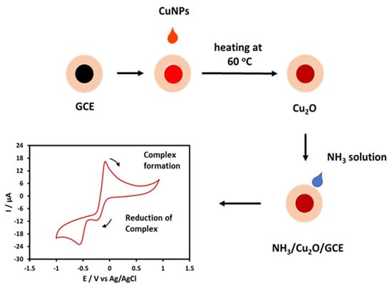 CuNPs are striking materials primarily due to their intrinsic properties and wide range of applications in various fields, including photocatalysis, perovskite solar cells, energy conversion, electrochemical detection/sensing, biosensing, gas sensors, and antimicrobial activity [18,19,20]. Due to their high electrical conductivity and chemical reactivity, CuNPs are also replacing Au and Ag in conductive pastes and catalysis applications [21,22]. Recently, CuNPs have been of particular interest in electrochemical detection applications as well. As a result, CuNP-based electrodes have emerged in the past few years as the most suitable alternative for the direct monitoring of a variety of analytes [23,24,25]. Due to copper-ammonia complex affinity [26,27], CuNPs can be an efficient electrode material for the simple electrochemical detection of NH3. However, the only report appears to be from Valentini et al. [17], who used multi-walled carbon nanotube/copper nanoparticles composite paste electrodes for the detection of NH3 in drinking water. The disadvantages of this method include the complicated fabrication steps, vague mechanism, and poor reproducibility of the proposed electrode.