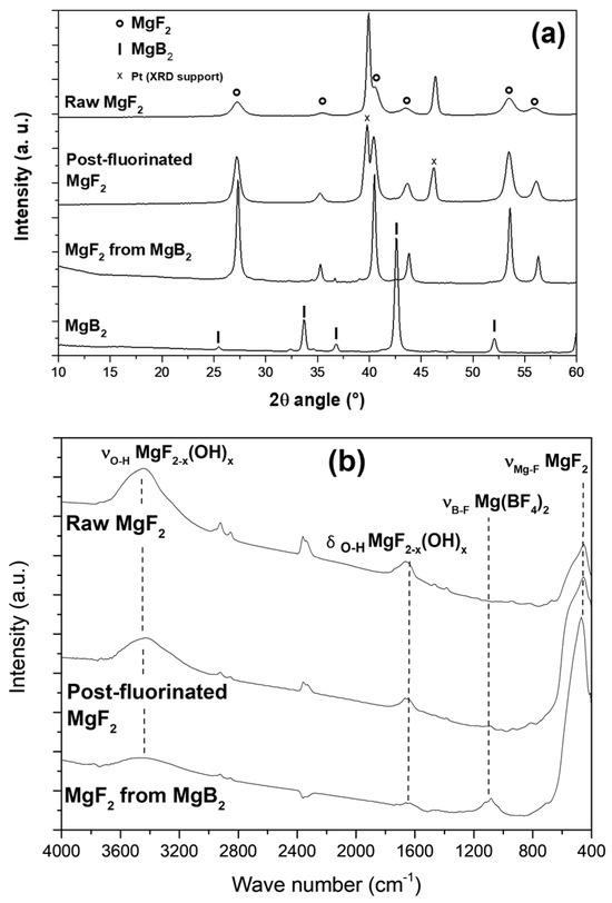 While the XRD pattern of the final product (Figure 1a) reveals only magnesium difluoride MgF2 [28,29] with traces of MgB2, the presence of the intermediate product Mg(BF4)2 is unambiguously revealed by FTIR spectroscopy (Figure 1b) considering the B-F bond vibration bands of at 1111, 1080, 461 cm−1 [30].