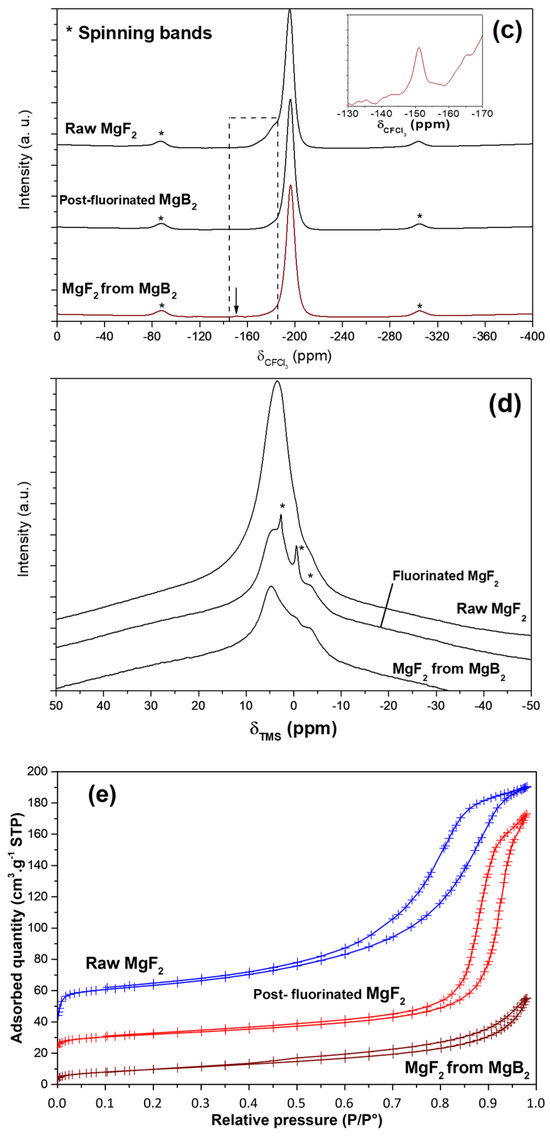 It is worthwhile to note that no shoulders indicating the presence of hydroxyl groups are observed in the final product. As a matter of fact, OH groups result in a change in electronic density around the 19F nuclei in their neighboring and consequently a small band should appear at higher chemical shift due to the decrease in the Mg-F bond ionicity (increase in the covalence of the Mg-F bond). A band or shoulder is then observed in the −160/−180 ppm range for other MgF2 samples; its intensity is related to the synthesis and post-treatment but mainly to the nature and concentration of the hydroxyl groups substituting fluorine. The higher the intensity of this band, the higher the content of hydroxyl groups, (Figure 1c). The 1H NMR spectrum of MgF2 without oxygen (Figure 1d) confirms the absence of hydroxyl groups. The objective of preparing oxygen-free MgF2 is thus reached. The sample obtained by fluorination of the magnesium diboride precursor exhibits a type II profile for the N2 isotherm (Figure 1e), typical of non-porous or macroporous materials.