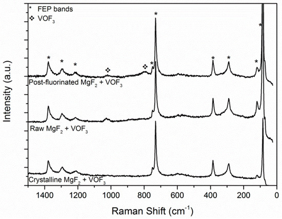 HF is unambiguously the product of a chemical reaction occurring between MgF2−x(OH)x and VOF3. This constitutes another proof of a chemisorption process. V=O and V-F vibration bands characteristic of vanadium oxyfluoride were also detected with Raman spectroscopy (Figure 3).