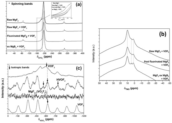After sorption of VOF3, the 19F NMR spectra show a single line due to Mg-F bonds (Figure 4a). The shoulder indicating the presence of hydroxyl groups disappears after the sorption. A chemical reaction occurs that removes OH− groups from the surface of MgF2 and involves the volatile compound. No further lines due to fluorinated vanadium compounds are observed in the final product. For the 1H NMR spectra (Figure 4b), the peak intensity assigned to hydroxyl groups in MgF2 decreases for another contribution at a chemical shift of +9 ppm. This band is assigned to the interaction between vanadium oxyfluoride and protons and confirms the chemical reaction between the OH− groups and VOF3. 51V NMR spectra recorded at different spinning rates in order to distinguish between isotropic and spinning bands (Figure 4c) reveal the presence of 3 isotropic bands for raw and post-fluorinated MgF2 exposed to VOF3. The isotropic bands at −561, −615 and −791 ppm refer to VO2F2−, VOF3 and VOF4−, respectively [36,37,38].
