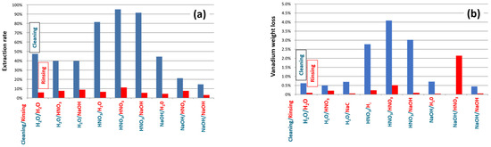 (a) Extraction rate of vanadium and (b) vanadium weight loss according to the cleaning and rinsing agents.