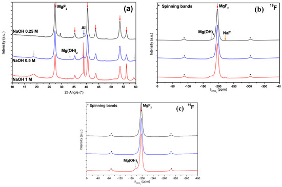 XRD patterns (a) and 19F MAS NMR spectra (b) of raw MgF2 treated with NaOH solutions; (c) 19F MAS NMR spectra of post-treated MgF2 exposed to VOF3, after cleaning (with HNO3) and rinsing (H2O) at 60 °C and regeneration with NaOH.