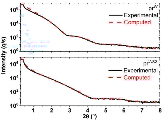 XRR diagrams of the prW and prWS2 precursor thin films. The experimental XRR patterns (in black) for both prW and prWS2 thin films, overlapping with their respective fitted diagrams (in red). The fitted curves are derived based on a specific model of each thin film, accounting for thickness, electronic density, and surface roughness.