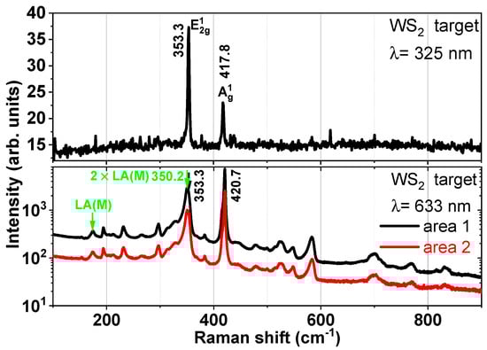 Micro-Raman spectra for two excitation radiation wavelengths (325 nm and 633 nm) of the WS2 sputtering target. Different areas of the target were examined to check the uniformity. Some of the double-resonant Raman bands, the LA(M) peaks, are highlighted in green.