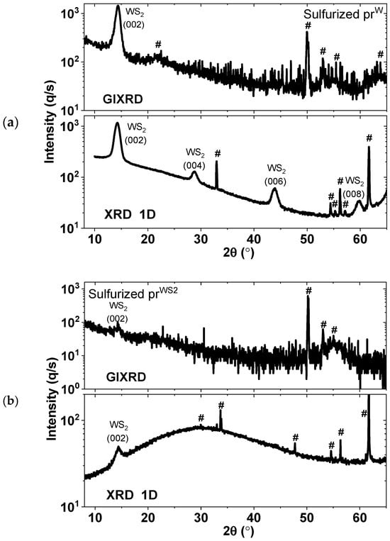 The structural analysis of sulfurized prW and prWS2 thin films was conducted using GIXRD (detector in 0D mode) and XRD (Bragg–Brentano geometry with detector in 1D mode). The corresponding diagrams for these films are depicted in Figure 4.