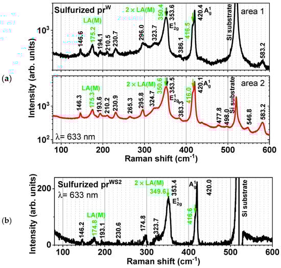 Upon irradiating the surface of the sulfurized prW and prWS2 samples, in various areas using a micron-sized laser spot, the micro-Raman (m-Raman) spectra were recorded. These measurements, particularly at the excitation radiation wavelength of 633 nm, revealed the presence of double-resonant Raman processes (shown in Figure 5). For a second-order Raman process to meet the requirements for double resonance, the optical excitation energy must match a vertical electronic transition, and the conduction band must contain quasi-isoenergetic electronic states at the difference in momentum corresponding to the phonon’s momentum ±q (or similarly for the valence band in the case of hole–phonon scattering). The momentum dependence of the electronic structure and phonon dispersion must combine to produce a narrow peak in momentum space to yield a narrow double-resonant Raman peak []. Analyzing the m-Raman spectra for the prW sample, several observations can be made. Firstly, the sulfurization process resulted in the formation of the hexagonal WS2 crystalline phase, as indicated by the spectrum being almost identical to that of bulk WS2. The intensity variation in the silicon substrate’s peak at 520 cm−1 across different areas of the WS2 layer suggests varying thicknesses, with an intensity ratio higher by 5.3 times in area 1 as compared with area 2. From the frequency value of the A1g peak, we can conclude that WS2 crystallites with more than three layers are formed.