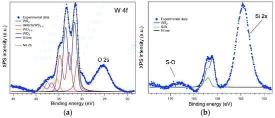 The XPS spectrum for the deep levels of interest of W (4f5/2 and 4f7/2) in the sulfurized prW sample is displayed in Figure 8a. The dominant component in the W 4f spectrum represents WS2, at binding energies of 31.5 eV (4f7/2) and 33.5 eV (4f5/2), accounting for approximately 53% of the integral amplitude. The components at binding energies of 32.8 eV (4f7/2) and 34.8 eV (4f5/2) are associated with W, the undercoordinated WS2, and surface defects. The last two components associated with W-O bonds represent ~16% of the W total. A significant Na 2p contribution overlaps with the W 4f spectrum. This could be due to contamination during sulfurization.