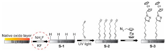 - Ciampi, S.; Böcking, T.; Kilian, K.A.; James, M.; Harper, J.B.; Gooding, J.J. Functionalization of acetylene-terminated monolayers on Si (100) surfaces: A click chemistry approach. Langmuir 2007, 23, 9320–9329. [Google Scholar] [CrossRef] [PubMed]