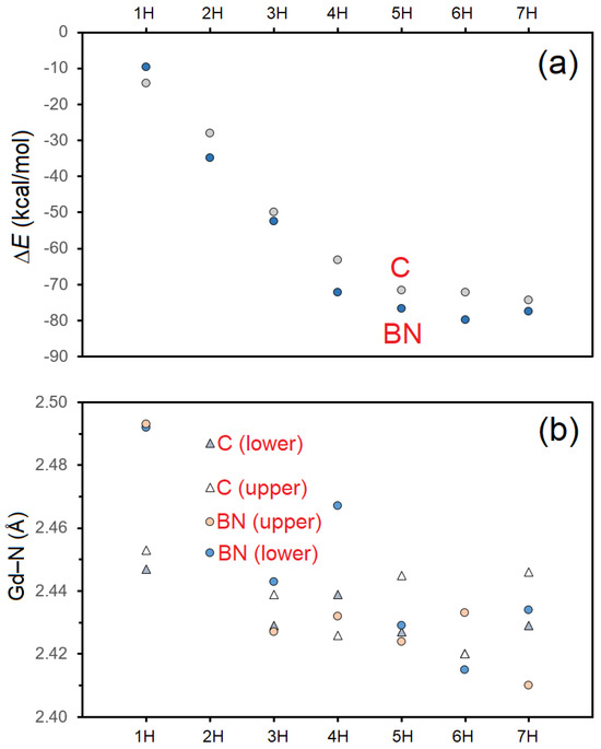 In the case of the graphene models, the weakest interaction, of −14.2 kcal/mol, was logically found with the benzene molecule (the smallest C-1H model), reaching −74.4 kcal/mol for the largest nanocluster C-7H. Despite the fact that the molecular weight of C60 fullerene best matches that of the C-3H model, its strong spherical curvature prevents efficient contact between the two components, and the ΔE value of −25.6 kcal/mol for GdPc2 + C60 is actually closer to the one of −28.0 kcal/mol obtained for GdPc2 + C-2H. With the exception of the first member of the hBN models, that is, borazine (ΔE of −9.7 kcal/mol), their bonding with GdPc2 is stronger compared to that of the analogous graphene models, roughly by a few kcal/mol. From Figure 3a, it is more evident that until reaching the complexes with C-4H and BN-4H, the ΔE values tend to decrease almost linearly, then the changes become less apparent. While the lowest ΔE value in the carbon series was obtained for the largest nanocluster C-7H, in the case of the BN series, the bonding strength slightly fluctuates: −76.7, −79.8, and −77.5 kcal/mol for GdPc2 + BN-5H, GdPc2 + BN-6H, and GdPc2 + BN-7H, respectively. That is, the strongest bonding was obtained with the BN-6H model. For comparison, we also calculated the formation energy for the (GdPc2)2 π–π stacking dimer, which is −60.2 kcal/mol, and thus is situated between those obtained for the GdPc2 + X-3H and GdPc2 + X-4H (X = C, BN) noncovalent complexes.