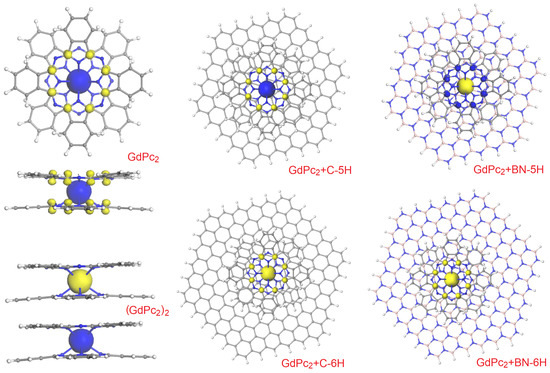 One of the electronic parameters analyzed was the (positive) charge of the Gd ion (Table 1). In the isolated GdPc2 molecule, it is 1.300e, with a notable increase to 1.337e on both gadolinium ions in the (GdPc2)2 dimer. Similarly, it increases upon complexation with any graphene or hBN model. In the latter case, the span of Gd charge values is especially wide, from a very minor increase to 1.303e in GdPc2 + BN-7H to a rather high value of 1.408e for the first member of the BN series, GdPc2 + BN-1H. In the graphene series, the corresponding values are found to be between 1.307 e (GdPc2 + C-6H) and 1.367e (GdPc2 + C-1H). At the same time, the spin of the Gd ion is a relatively invariant characteristic, though its direction (up and down, meaning positive and negative values, respectively) is random. In the isolated GdPc2 molecule, it is 7.007e (spin-up, as shown in Figure 4). In the (GdPc2)2 dimer, both absolute Gd spin values are the same of 7.004e, but with opposite signs/directions (Table 1). The lowest absolute value of 7.000e was obtained for the GdPc2 + C-2H complex, and the highest one of 7.008e was obtained for the fullerene derivative GdPc2 + C60.