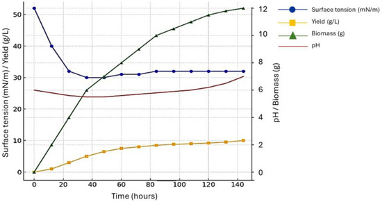Aliquots were collected throughout fermentation (2, 4, 6, 8, 12, 24, 30, 36, 48, 60, 72, 96, 120, and 144 h). The samples were filtered and centrifuged at 4500 rpm for 15 min at 9 °C. Surface tension, pH, and biosurfactant yield were determined in the cell-free broths. The dry weight of the biomass was determined after centrifuging 50 mL of the culture at 5000 rpm for 15 min, discarding the supernatant and drying the biomass in a laboratory oven at 105 °C for 24 h [12].