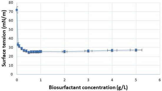 Biosurfactants with low molecular weight reduce surface tension, whereas those with high molecular weight form stable emulsions. The CMC is the minimum concentration of surfactant at the moment when micelles are formed in the solution [29].