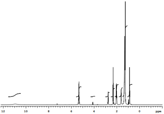 1H NMR spectrum for biosurfactant extract produced by C. lipolytica UCP0988 grown in medium containing molasses (4.0%), waste soybean oil (2.5%), and corn steep liquor (2.5%).