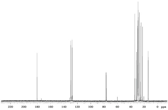 The 13C NMR (Figure 5) showed signals between 0and 40 ppm, characteristic of molecules containing a long carbon chain. The signal found at 60 ppm may be responsible for the hydroxyl present in the molecular structure, the signal at 80 ppm is responsible for the solvent used in the analysis (deuterated chloroform), the peaks found in the region between 120 ppm and 140 ppm relate to double bonds and, finally, the signal in the 180 ppm region is characteristic of the carboxylic acid group.