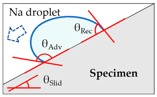 The sliding method was used for the wettability test in this study. The specimen was placed on a ceramic hot plate placed horizontally on a tiltable table, and 500 μL of Na droplet was added dropwise onto it. The temperature of the specimen and the Na droplet was 150 °C. After 3 min of adding the Na droplet onto the specimen, the tiltable table was tilted at 1°/s until the droplet slid down. The angle at which the droplet slid down was recorded as the sliding angle. Advancing and receding contact angles were measured from the shape of the droplet as it slid down using a video taken with a camera. (Figure 1) The measurements were performed five or more times for each specimen, and the average value was taken as the evaluation value.