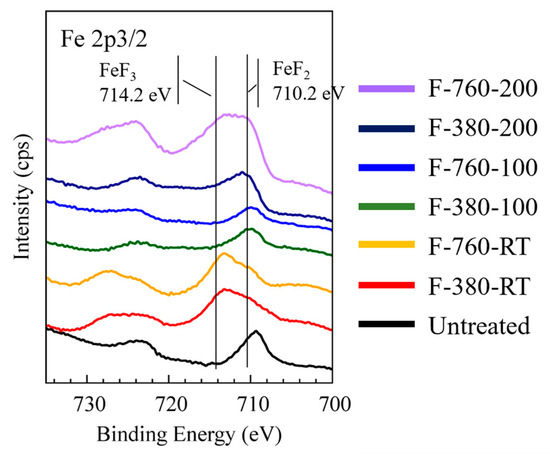Figure 2 shows the Fe 2p3/2 peaks on the outermost surface of the specimens measured using XPS. Two peaks near 710 and 714 eV were observed on the surface of the fluorinated specimens. Kasrai et al. reported that the FeF2 and FeF3 peaks, typical iron fluorides, were detected at 710.2 and 714.2 eV, respectively [26]. Therefore, in Figure 2, the peak detected on the high-energy side should be FeF3 bonds, and the peak detected on the low-energy side should be FeF2 bonds.