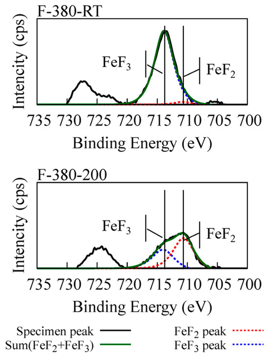 Figure 3 shows the fitting results of the Fe 2p3/2 peaks for F-380-RT and F-760-200. Since only FeF2 and FeF3 peaks are used for fitting, nonstoichiometric compounds resulting in FeFx (x < 2, 2 < x < 3) are not considered. In F-380-RT, the ratio of each iron fluoride peak was FeF2:FeF3 = 11.6:88.4, and the bonding of the outermost surface was FeF3 bonding-rich. In F-380-200, the peak ratio of each iron fluoride was FeF2:FeF3 = 72.6:27.4, and the bonding of the outermost surface was FeF2 bonding-rich. From the above, the FeF3 bonding-rich surface or FeF2 bonding-rich surface was formed on the specimen by adjusting the fluorination conditions. However, only the FeF2 or FeF3 bond was not formed on the specimen surface. Furthermore, since this is a surface treatment method involving F2 gas contact, the bond of the nonstoichiometric compound FeFx (x < 2, 2 < x < 3) might exist on the specimen surface. Therefore, the specimen surface formed by fluorination was thought to have a complex bonding state.