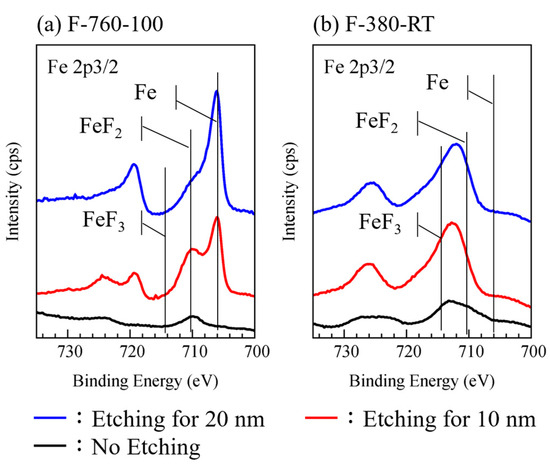 Figure 4 shows the measurement results of the Fe 2p3/2 peak when the surface of the F-760-100 and F-380-RT specimens was etched to a depth of 20 nm using argon ion. The etching changed the binding state on the surface of the F-760-100 specimen, where the metal Fe peak appeared and became stronger, and the fluoride peak became significantly weaker. In contrast, iron peak was not detected in the F-380-RT specimen even after etching to 20 nm, and only fluoride peaks were detected. It was suggested that the fluoride layer on the F-760-100 specimen was thinner than that on the F-380-RT specimen. As a result of depth analysis using XPS, F-380-RT, F-760-RT, and F-760-200 formed a thick fluoride layer, and F-380-100, F-760-100, and F-380-200 formed a thin fluoride layer. For example, the thickness of the fluoride layer of F-760-100 was about 20 nm or less, and the thickness of the fluoride layer of F-760-200 was 250 nm or more.