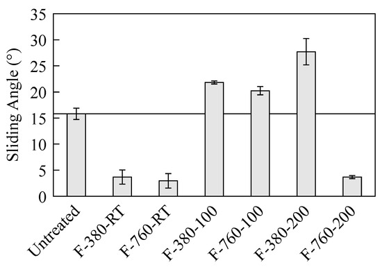 - F-380-RT, F-760-RT, and F-760-200 specimens had small sliding angles of Na droplets at measurement and a small deformation in the Na droplet shape.