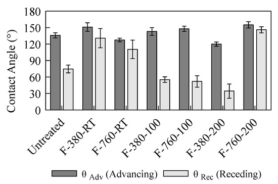 The above clarifies the effect of fluorination on the wettability of liquid Na. Furthermore, depending on the fluorination conditions, the wettability of liquid Na changed to lyophilic and lyophobic states. Figure 8 shows the advancing and receding contact angles when a Na droplet slides down the specimen surface. Compared with the untreated specimen, the receding contact angles of F-380-RT, F-760-RT, and F-760-200 are larger, whereas those of F-380-100, F-760-100, and F-380-200 are smaller. The difference between each specimen was smaller in the advancing contact angle than in the receding contact angle.