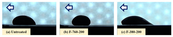 An iron (Fe) plate manufactured by The Nilaco Corporation (FE-223383, 99.5%) was used as the substrate. The test specimens (40 × 40 mm) were cut from iron plates for analysis and wettability experiments and ultrasonically cleaned in acetone. The test specimens were sealed in a nickel reactor and connected to a fluorination apparatus described in a previous paper by the authors [25]. The fluoridation conditions were based on those used in our previous study [22]. The F2 gas pressures in the reactor were 380 Torr (50.7 kPa) or 760 Torr (101.3 kPa), the reaction temperatures were room temperature (25 °C), 100 °C, or 200 °C, and a reaction time of 24 h was used for fluorination conditions. Table 1 shows the fluorination conditions. The specimen names in Table 1 indicate the gas pressure and reaction temperature used in fluorination. Untreated indicates unfluorinated specimens.