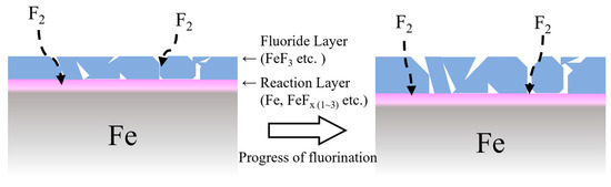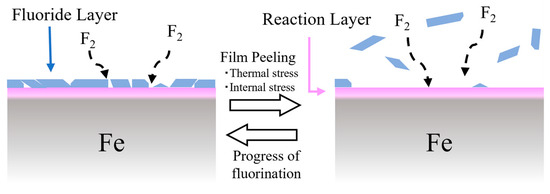 The other formation process involves the specimens fluorinated at high temperatures and with thin fluoride layers. Figure 11 shows a schematic diagram of its fluoride layer cross-section. A strong peak of the FeF2 bond was detected on the surface of the F-760-100 specimen fluorinated at 100 °C by XPS analysis, and its fluoride layer was thin (Figure 4). Therefore, as shown in Figure 11, the specimen surface fluorinated with heat has a fluoride layer (FeF3) that is quickly formed and peeled due to thermal stress frequently occurring, and a reaction layer primarily comprising FeF2 bonds might be exposed on the surface. This process would be applied to the specimens fluorinated at high temperatures but not to F-760-200, which was fluorinated with heat, but that surface condition was close to a specimen fluorinated at room temperature. From the comparison with F-380-200, the F2 gas pressure might cause the difference but a further experimental investigation is required to explain it.