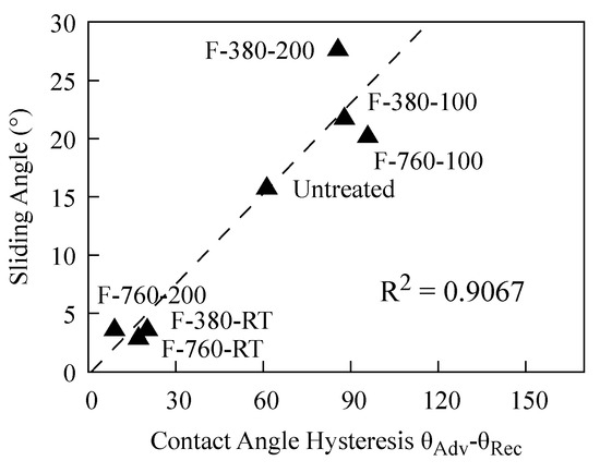 Figure 12 shows the relationship between the contact angle hysteresis and the sliding angle obtained from the wettability test. The contact angle hysteresis is the difference between the advancing contact angle (θAdv) and the receding contact angle (θRec)—one of the indicators of the wettability of a droplet sliding down a solid surface. The larger the contact angle hysteresis, the better the lyophilic state, and vice versa.