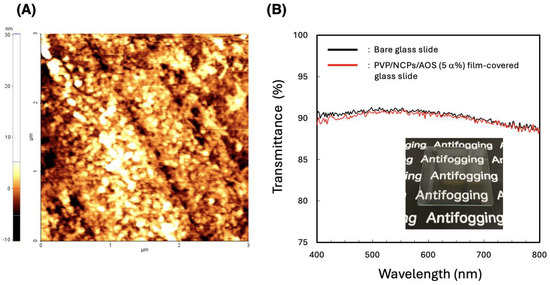 When investigating hygroscopic properties, the films showed noticeable changes in mass when exposed to 80 °C hot water vapors. PVP/NCP/AOS (5 α%) films could gain approximately 65% of their mass when pre-wetted for 10 min. However, even when left in high humidity environments (>90% relative humidity (R.H.)), there was no significant mass change, even after 24 h. Therefore, the hygroscopic nature of these films was affected by increasing the α% content. We believe that because of the improved resistance to water, our films are less likely to absorb atmospheric water but otherwise can be swelled using hot water vapors. By increasing the cross-linking density, we also anticipated that the durability of the antifogging properties would be improved. These PVP/NCP/AOS (5 α%) films maintained their robust antifogging for more than 3 months under laboratory conditions (~20 °C and 20–50% R.H.) or for 1 month under high humidity (>90% R.H.) conditions. No fogging was observed in simple breath tests. Therefore, the increased cross-linking density did improve the durability of the antifogging properties over our previously optimized films [