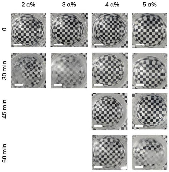 30]. When using the alternative mixing method in this study, there was better dissolution of PVP, NCPs, and AOS; inhomogeneity within the PVP/NCP/AOS precursor solution was not observed even when the AOS content was substantially increased up to 100 α%. However, above 10 α%, the as-casted films began to display several noteworthy instabilities, such as inhomogeneous coverage and radial instabilities. Therefore, in this study, we kept the α content at less than or equal to 5%.
