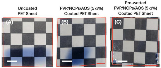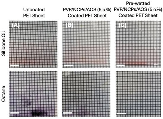 Figure 5. When the pre-wetted PVP/NCP/AOS (5 α%) film-coated PET sheets were immersed in octane, they continued to display excellent oil-repellency, similar to canola oil. However, for the silicone oil, there was no significant difference in the amount of dyed oil remaining on the film surfaces. This may be attributed to PET being a material that is naturally resistant to silicone-based oils [