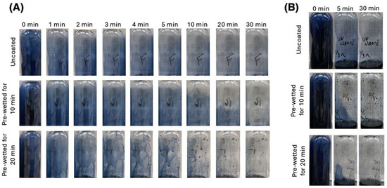 35], we thus believe that it may have extracted the excess water formed from the increased post-treatment time and removed some of the absorbed water along with it, reducing the overall effectiveness of the oil-repellent properties. This is supported by the fact that for coated PET bottles, after being pre-wetted for 20 min, their films initially supported a 133% increase in mass (as opposed to 65% for 10 min of pre-wetting), yet after approximately 24 h, excess water was visible within the sealed container that had 20 min of pre-wetting, indicating that excess water was slowly being expelled from the hydrogel-based films. However, PVP/NCP/AOS (5 α%) film-coated PET bottles that were pre-wetted for 10 min had no excess water visible.