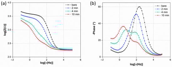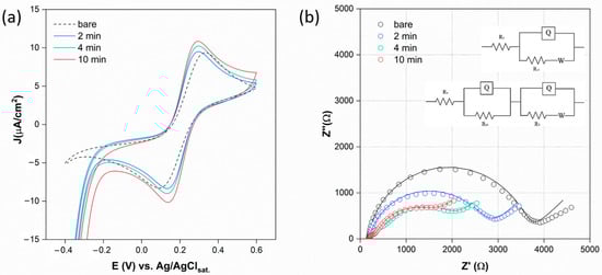 The EIS measurements are carried out for the same platforms, and the Nyquist plots are reported in Figure 2b. The impedance curves are fitted using a typical Randles circuit in the case of 0 and 2 min, while those at 10 min are fitted using an R(QR)(Q[RW]) circuit, obtaining the characteristic system parameters reported in the Supplementary Materials (Table S1).