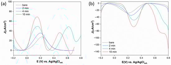 DPV measurements conducted under oxidation and reduction conditions (Figure 4a,b) allowed for a better characterization of the electrochemical behavior of the modified platforms. For ferrocyanide oxidation, the peak occurs at 0.22 V for the bare electrode, progressively shifting to lower potentials with increasing deposition time (0.2 V at 2 min, 0.15 V at 4 and 10 min). This indicates a gradually more favorable ET process promoted by the increasing concentration of AuNPs. The peak current also increases, reaching its highest value at 10 min. Similar behavior is observed under reduction conditions. After 4 and 10 min, an additional ET process is evident under both oxidation and reduction conditions, even in the absence of oxygen and ferricyanide likely due to the oxidation and reduction of Au. The literature shows that oxidation under acidic conditions is generally not appreciable for adsorbed spherical AuNPs [41], whereas reduction is observed in DPV at 0.45 V vs. Ag/AgClsat. In this study, the highly anisotropic morphology of the AuNPs could account for their particularly high reactivity. The oxidation peak appears at 0.6 V at 4 min and shifts to 0.49 V at 10 min, with an increase in current intensity. This is probably due to the more spiky morphology [42,43] of AuNPs obtained after 10 min of deposition (Figure 1e,f) and their higher concentration. In the case of reduction, the additional ET process is less pronounced, increasing in current with the higher AuNPs concentration.