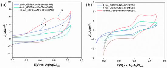 (a) CV measurements of GSPE surfaces functionalized with AuNPs at different HAuCl4 deposition times, modified with 6Fc-ht through the SAM procedure performed in KCl 0.1 M, between 0 and 0.85 V vs. Ag/AgClsat., rate = 10 mV/s. 6Fc-ht oxidation signals (1, 2, and 3) and gold oxidation signals (4, 5); (b) CV measurements of GSPE surfaces functionalized with AuNPs at different HAuCl4 deposition times, modified with 6Fc-ht through the ESI technique performed in KCl 0.1 M between −0.2 and 0.5 V vs. Ag/AgClsat., rate = 10 mV/s.